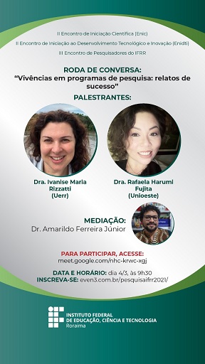 9h30 – Roda de conversa “Vivências em programas de pesquisa: relatos de sucesso”, com a Profa. Dra. Ivanise Maria Rizzatti (Uerr) e a Profa. Dra. Rafaela Harumi Fujita (Unioeste), com mediação do Prof. Dr. Amarildo Ferreira Júnior (IFRR)